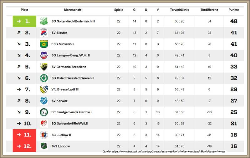 Auf dem einzigen Abstiegsplatz rangiert weiter der SC Lüchow II, der nach 99 Gegentoren auch froh über die rund fünfmonatige Winterpause sein dürfte.