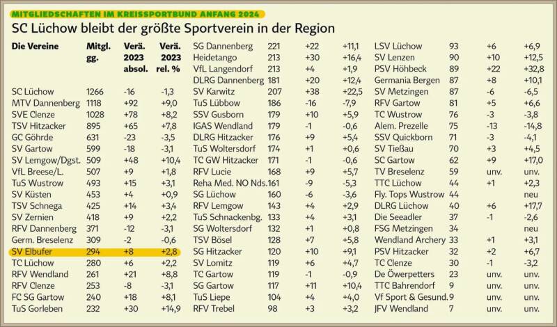 Bei den Sportarten liegt König Fußball mit knapp 3 900 Mitgliedschaften (+66 im Vergleich zu 2023) weiter vorne, gefolgt vom Turnen (3 280/+110), zu dem auch der Fitness- und Gesundheitsbereich gehört, dem Reiten (1496/+46), dem Schießen (1361/+104) und dem Tennis (968/+3). Geschrumpft sind aus den Top Ten der Sportarten